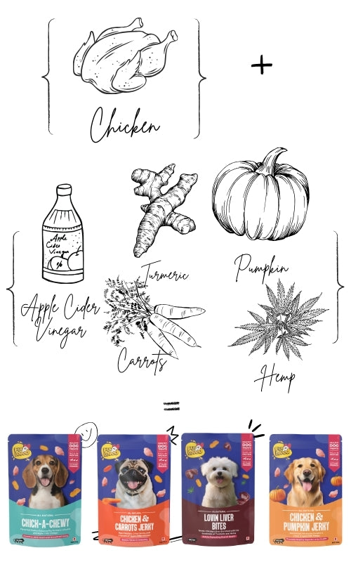 Treat your furry companion to Chick-A-Chewy, our all-natural jerky dog treats made from tender chicken strips, tangy apple cider vinegar, and a hint of turmeric. These treats are naturally dehydrated to...