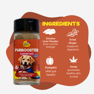 Our all-natural meal topper is packed with essential nutrients like iron-rich chicken liver powder, digestion-supporting ginger, gut-healthy pumpkin, and skin-nourishing hemp. It's a delicious and convenient way to boost your dog's energy, immunity, and overall well-being.