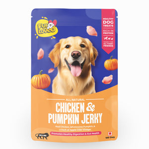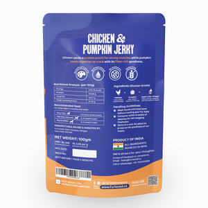 Crafted from the finest farm-fresh ingredients, Our Chicken & Pumpkin Jerky Treats For Dogs offer the wholesome goodness of both chicken and pumpkin that supports your dog's digestive health and enhances vision. Moreover, our jerky treats for dogs strengthens overall immunity and promotes a healthy skin and coat. Let your dog savor the delicious and nutritious benefits of these premium treats!