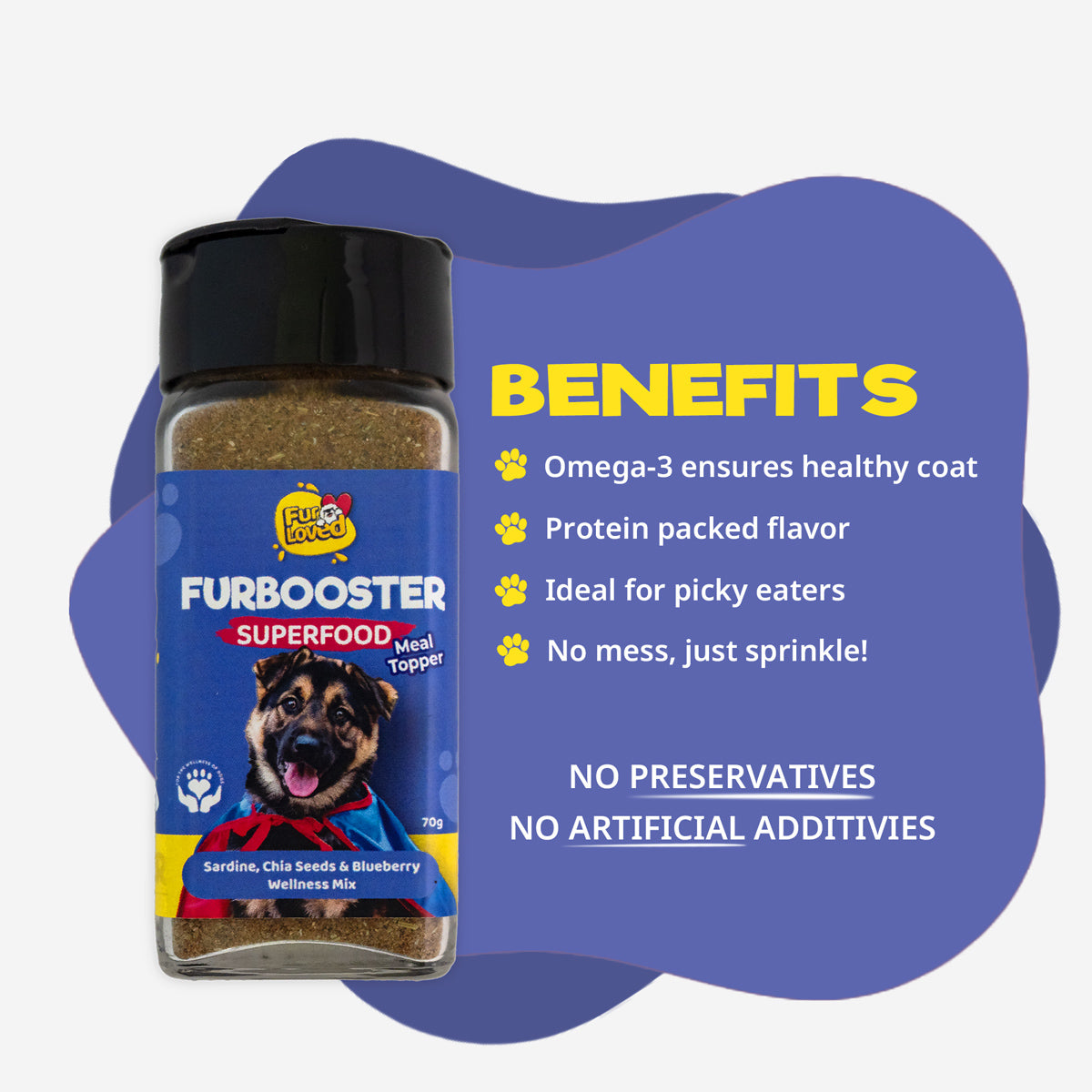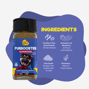 Elevate your dog's dining experience with Fur Booster Sardines Superfood Meal Topper, a delicious and all-natural meal topper designed to enhance the taste of their food and encourage healthy eating habits. Packed with essential nutrients like protein, antioxidants, and omega-3 fatty acids, Fur Booster is more than just a tasty treat; it's a nutritional boost that your furry friend will love.